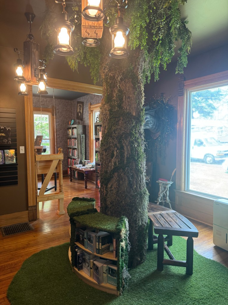 After checking out the mystery room and the banned book closet, I decided to head to the second location, which I was told had a “Shire Room” which did not disappoint. The second building is behind the first, located diagonally from the parking lot. It is in a grayish purple Victorian, with a small sitting area in the back of the first floor. It bodes a room designated to romance, fantasy, science fiction, and my favorite “The Shire Room.”